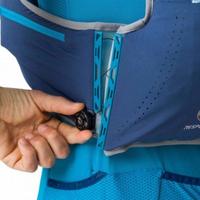 A hatalmas szájú kialakítás viszont egyértelmű pozitívum. Könnyű beleönteni flakonból is a folyadékot, vagy beleszórni veszteség nélkül az iso porokat. De ez sem menti meg a kulacsokat, érdemes inkább más gyártók termékeivel helyettesíteni, így teszek én is. Ekkor viszont megoldást kell találni arra, hogy a mellény kulacsrögzítő kis gumigyűrűi a gyári kulacs kupakjának átmérőjéhez vannak igazítva. Emiatt más kulacs használata esetén érdemes szűkebbre varrni ezeket a gyűrűket, vagy valamilyen szabályzó megoldást tenni rájuk. A nagy tároló rekeszbe kényelmesen befér még egy plusz víztartály is, amit egy kis tépőzáras pánttal lehet rögzíteni, és egy vízzáró elválasztó határolja el a tároló többi részétől. A 6 literes változatnál ez azért elég sok helyet elvesz a hasznos űrtartalomból, de az itthon kellő holmiknak még így is bőven beférnek.
